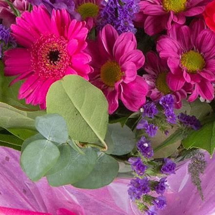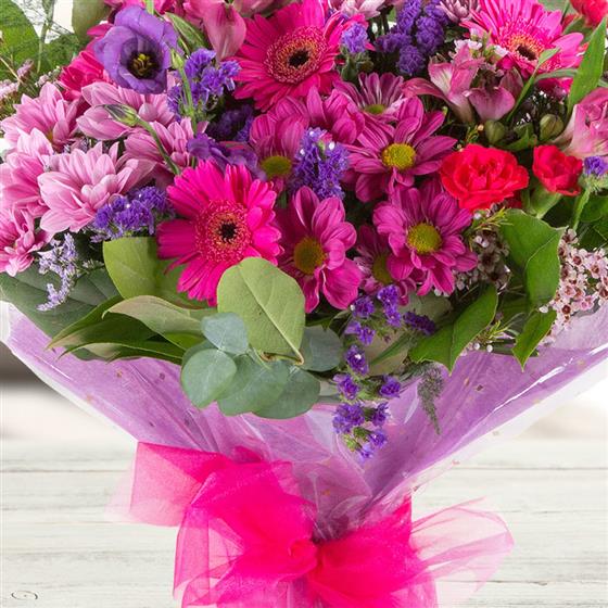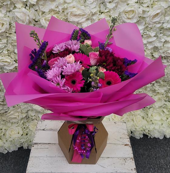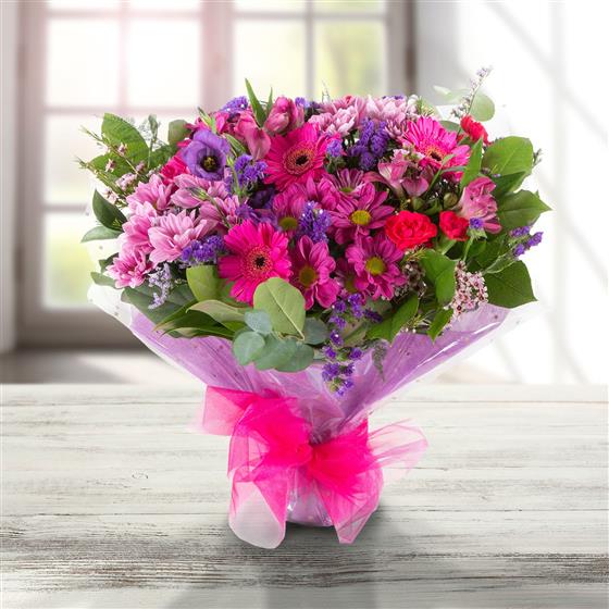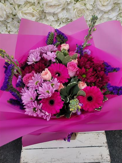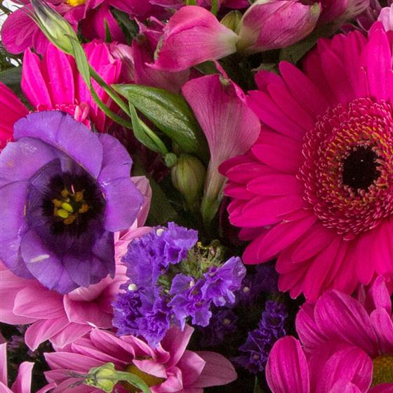 One of our most popular bouquets, a vibrant, seasonal mix of pretty pinks and purples.