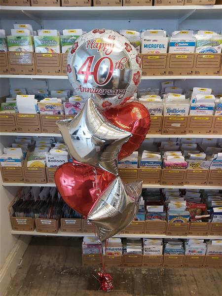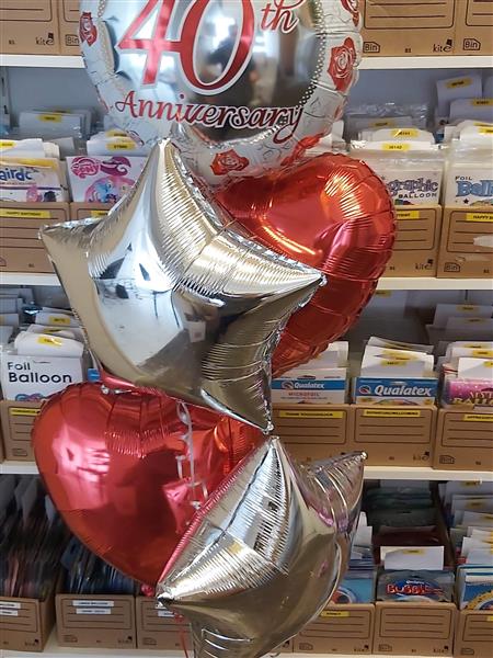 This 5 balloon bouquet can be adapted to any anniversary celebration. Examples happy anniversary, 25th, 30th 40th and many more options.