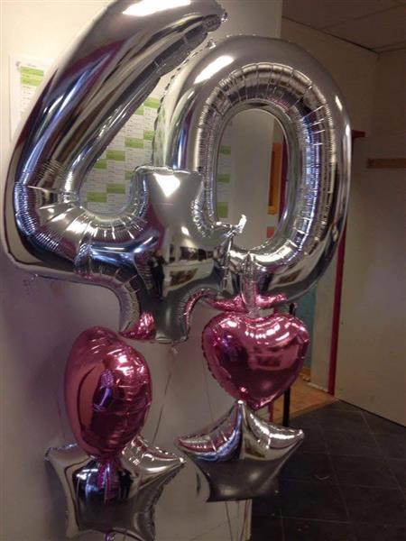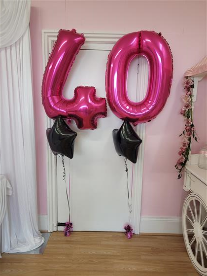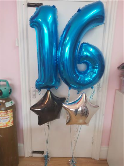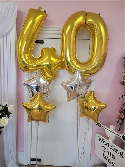 - 2 x 18″ colour foil balloons underneath 1x 18" balloon under each number (Stars in yout choice of colour scheme.
