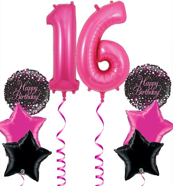 2x 3 foil balloon bouquets (1x printed happy birthday black & pink sparkling fizz balloon & 2 balloon balloons)