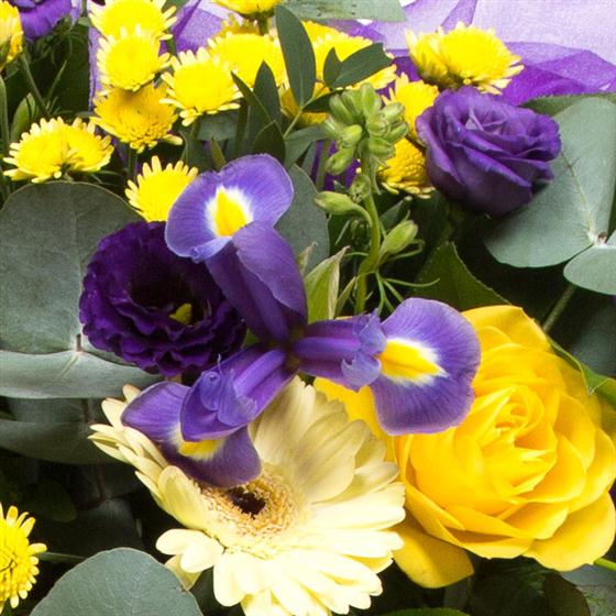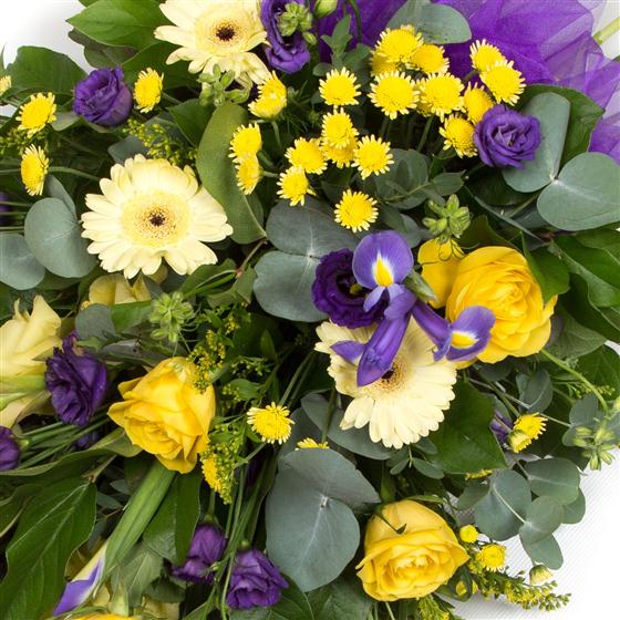 A luxury colourful tribute of seasonal blooms in shades of purple and lilac with contrasting golds and lemons.