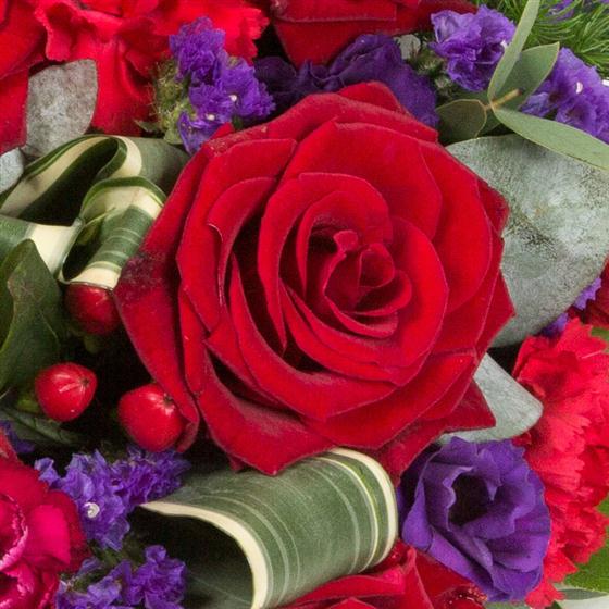 An all round posy arrangement of deep red roses, spray carnations and mixed with vibrant purple statice and lisianthus.