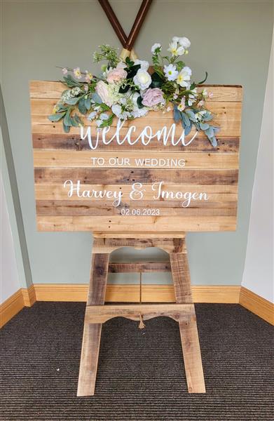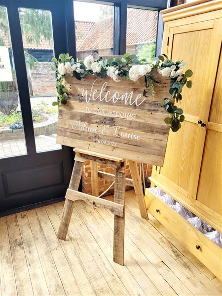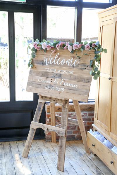 Our rustic personalised welcome to our wedding. This is personalised with your names & date of your wedding. Supplied on a floor standing rustic easel with eucalyptus garland & flowers.