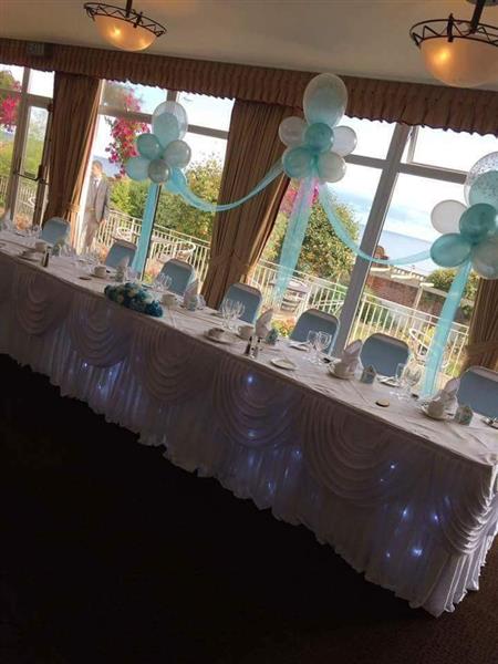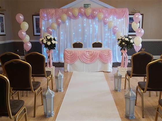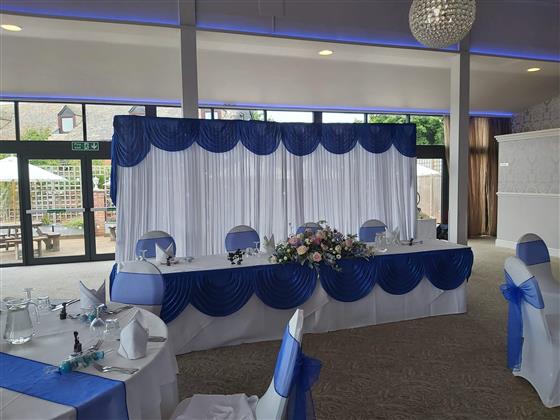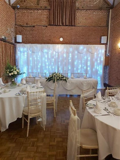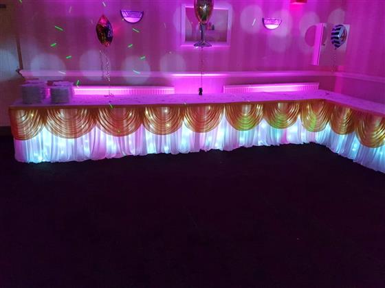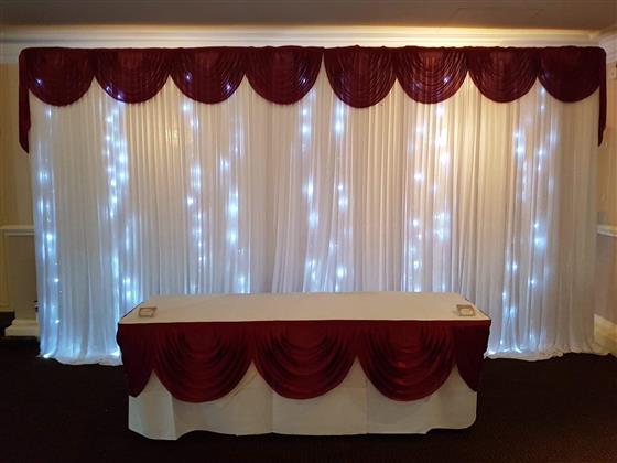 Starlight backdrop with swagging Top table & cake table swagging (Available in white, pink, gold, royal blue, red, burgundy, lilac, silver & purple)