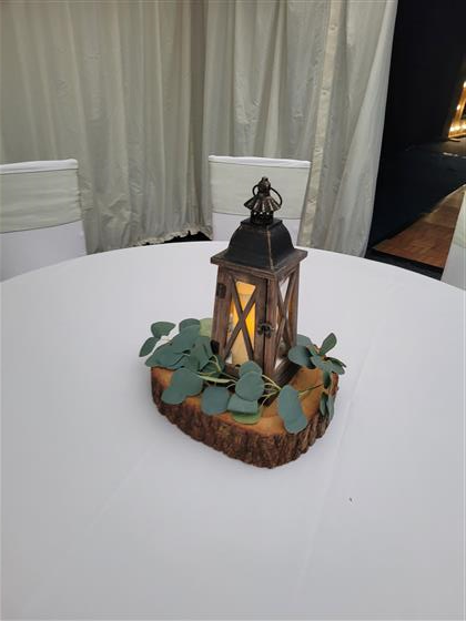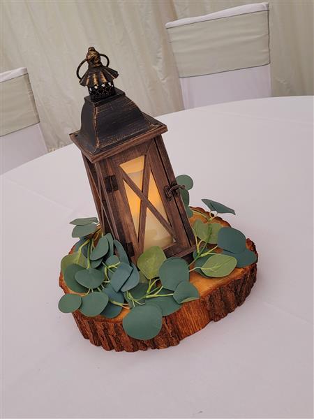 Centrepiece includes 1x wooden Lanterns supplied with 8x log slice & piece of foliage (placed around the lantern)
