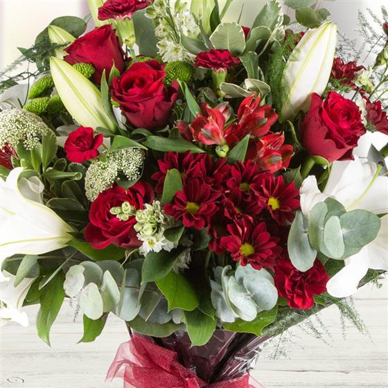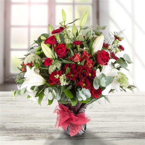 An seasonal collection including red roses, oriental lilies with a variety of red and lime blooms and foliage.